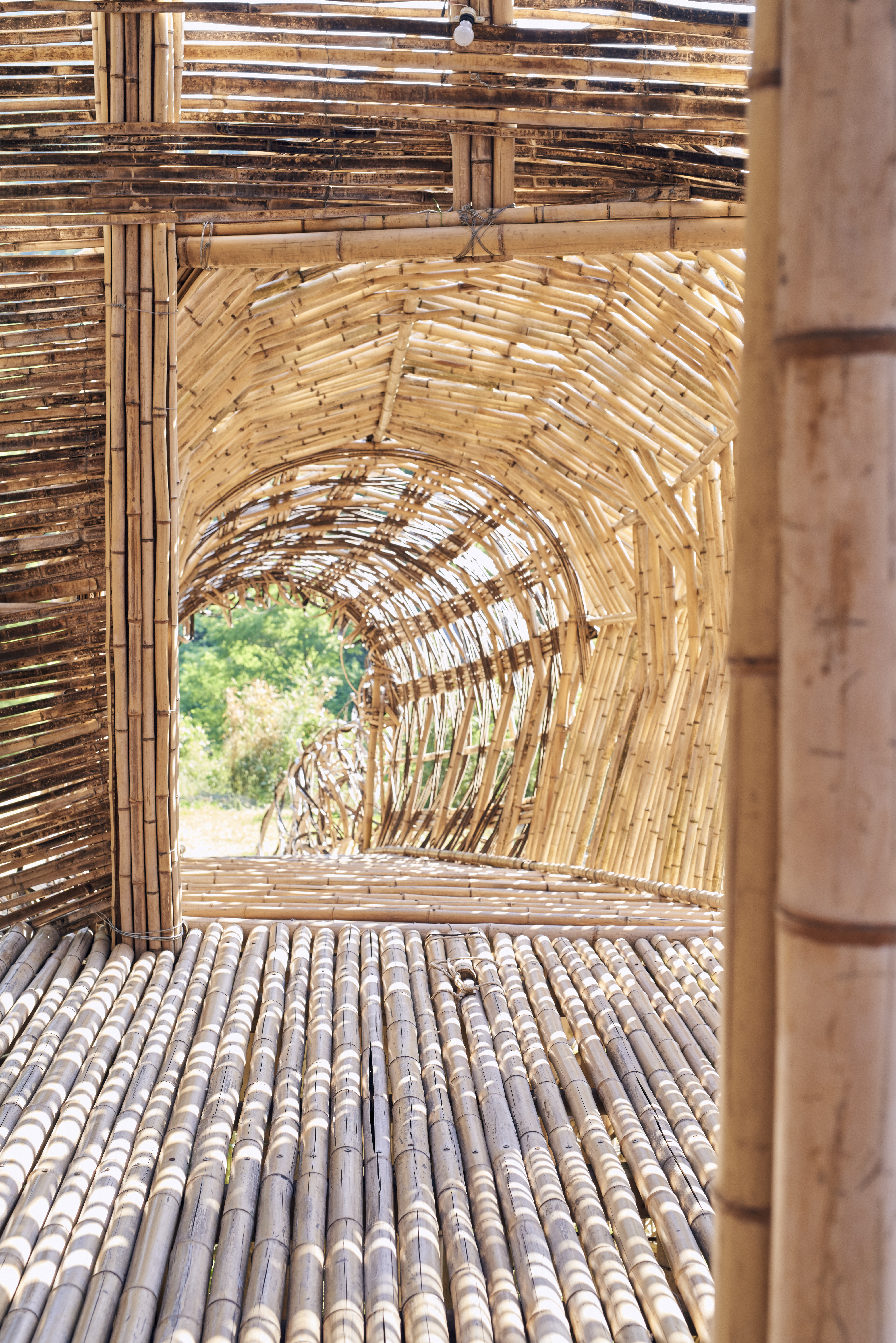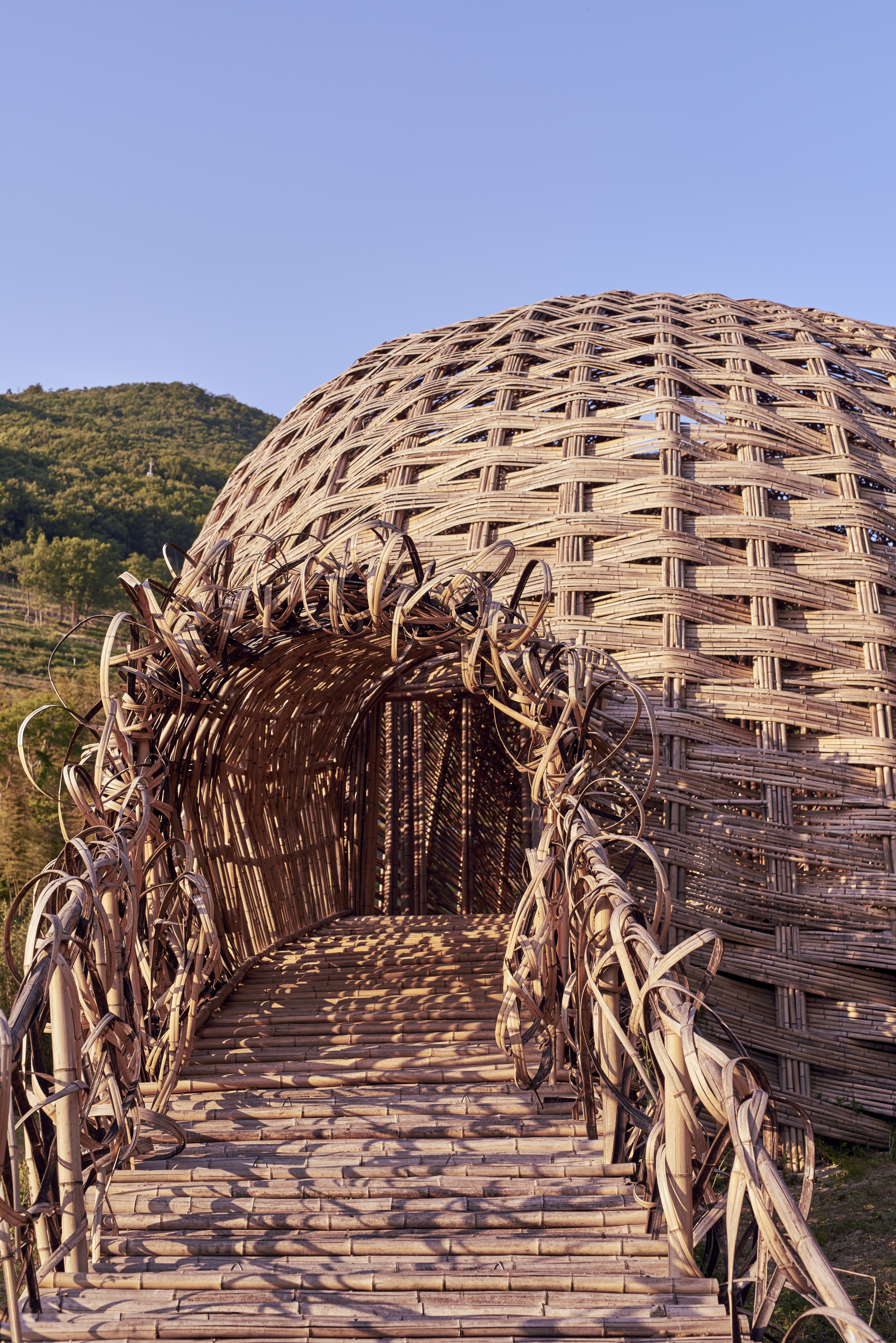 Transforming the tranquil landscape which it surrounds, this massive dome was constructed from over 5000 pieces of locally-grown bamboo.