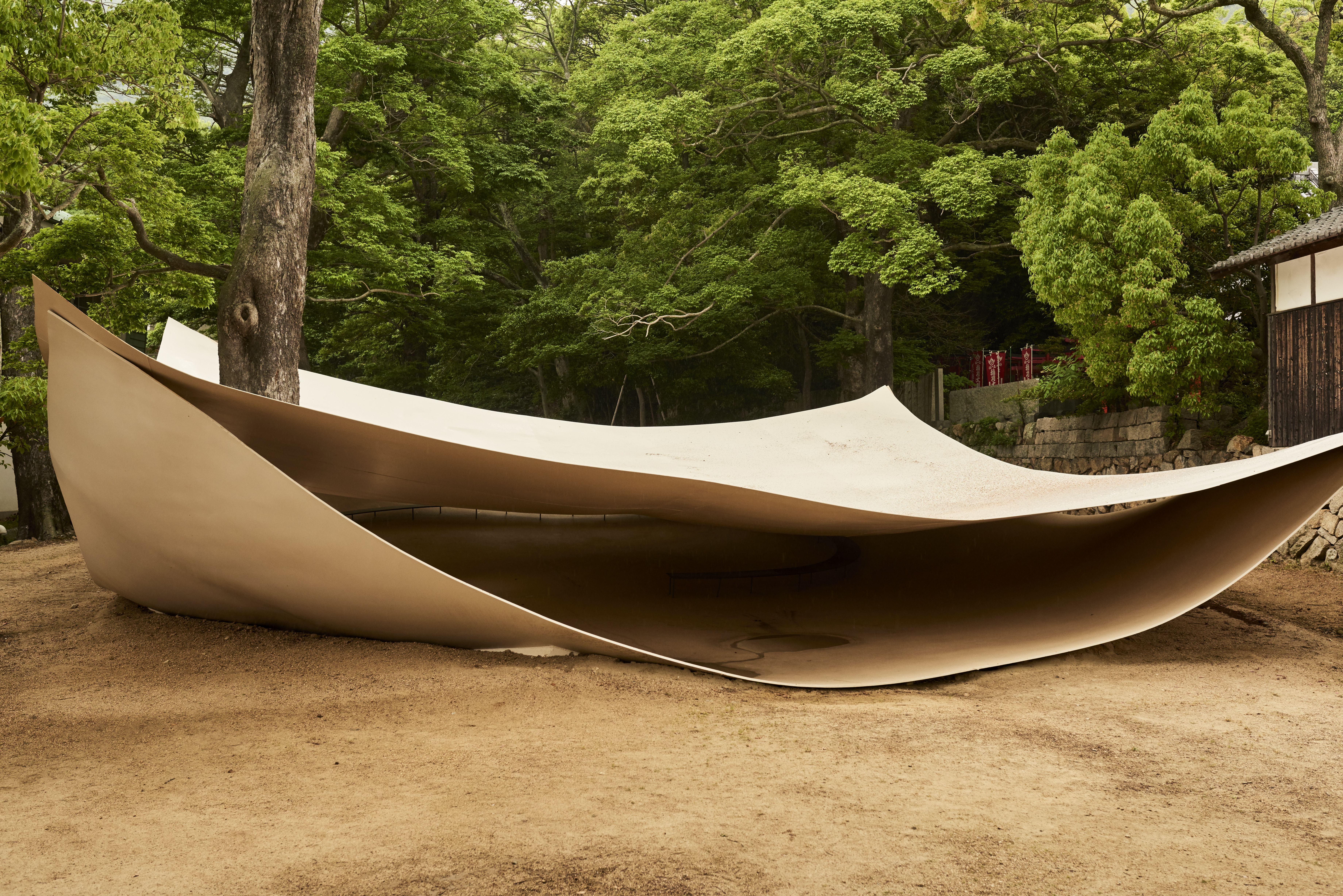 Placed in the grounds of the Fukita temple this artwork consists of 2 sheets of metal, which seem to miraculously float alongside one another. The man-made structure could seem out of place amongst the serene surroundings, yet it feels at one with nature.