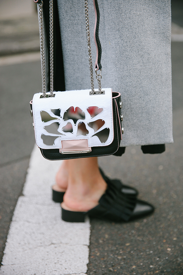 "MIMCO’S Trance Mini Hip (in Black/Alabaster) packs a sartorial punch with the combination of mirrored details, metal studs and a beautiful scalloped strap.