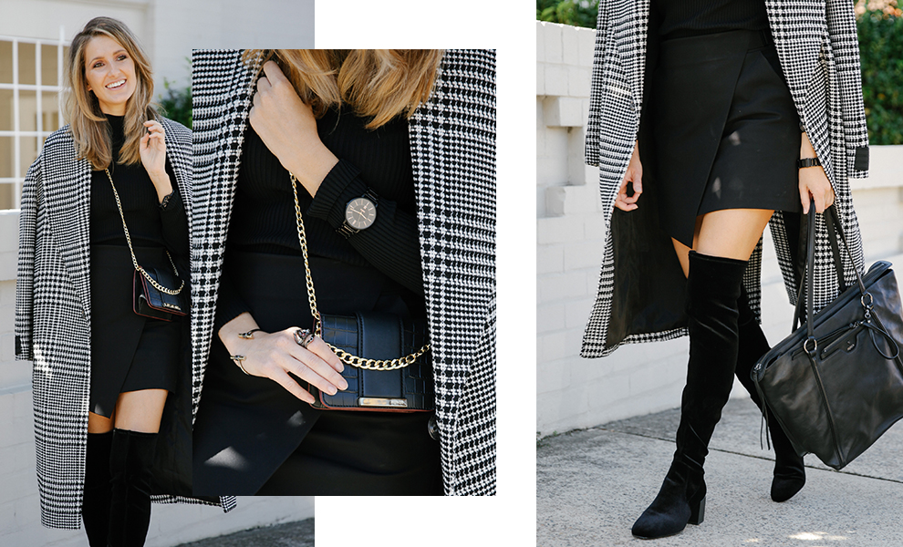 "Wearing a head-to-toe black look can sometimes look a little too intense, so I like to break it up with contrasting prints – such as an oversized houndstooth coat – and sleek accessory details. I like to limit my accessories to muted tones but also love to be able to tap into the season's biggest trends.