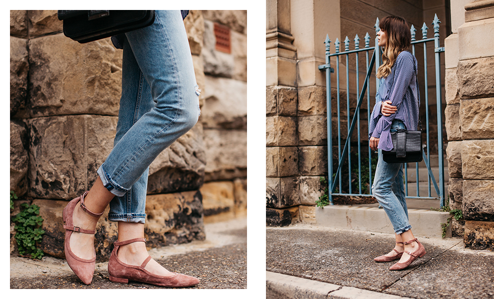 "This is my go-to outfit when all else fails. Styling a pair of straight-legged jeans, a blouse and the perfect pink flats will work for the office and Sunday brunch."